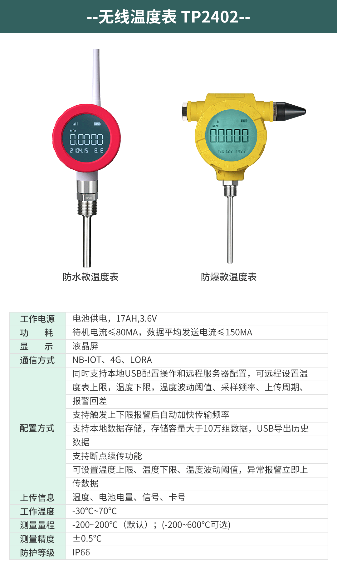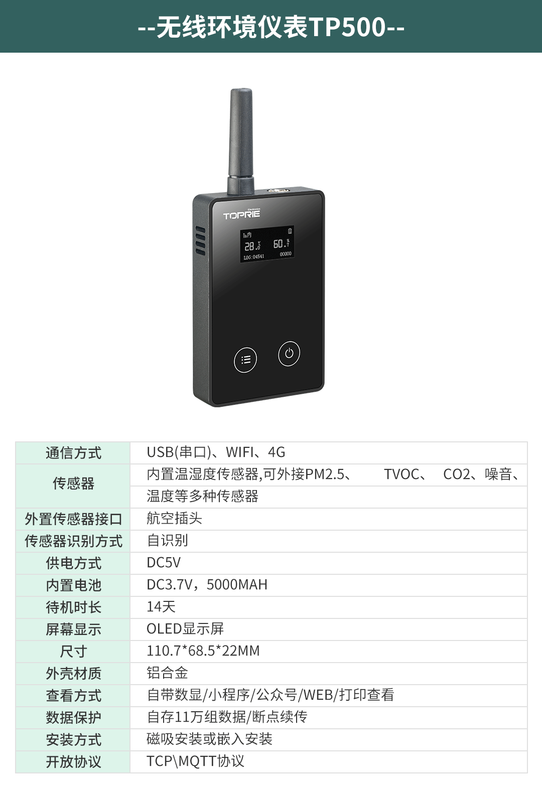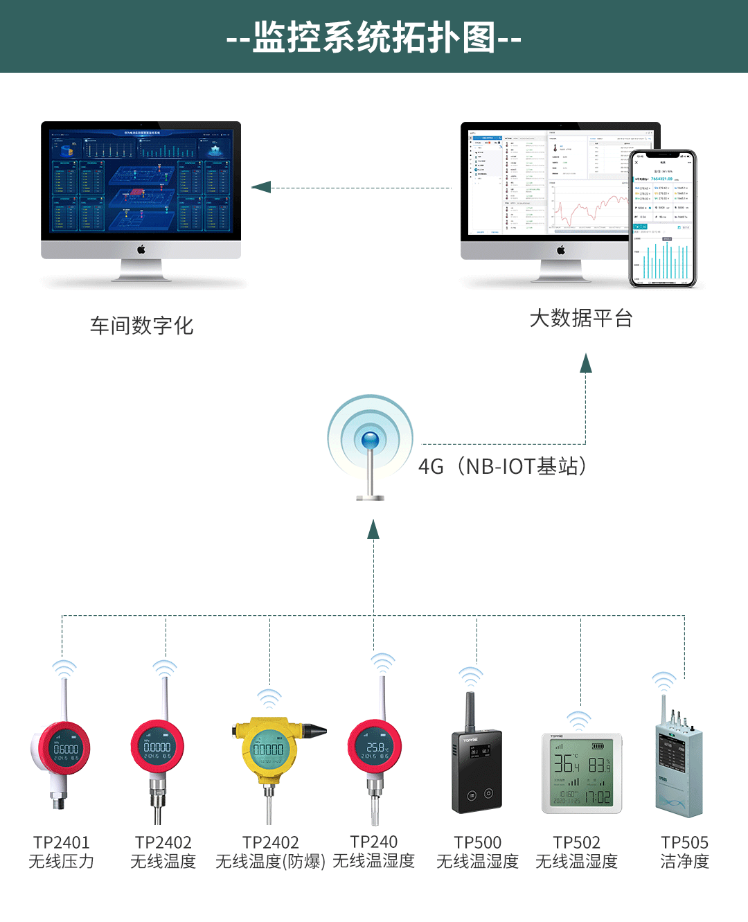 根據(jù)客戶不同的場景使用不同的傳感器進(jìn)行測量,比如冰箱或者冷庫的溫濕度采用TP500或者TP2406進(jìn)行測量,車間內(nèi)溫濕度可以采用TP500或者TP502進(jìn)行測量,管道蒸汽溫度或者管道油溫和水溫采用TP2402進(jìn)行測量,蒸汽壓力、油壓、水壓、氣壓等壓力采用TP2401進(jìn)行測量,生產(chǎn)車間的潔凈度采用TP505進(jìn)行測量