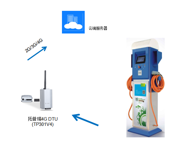 交流充電樁一般功率在數(shù)KW左右,適用于慢速充電,一般有RS485或者RS232接口,通過(guò)拓普瑞4G DTU(TP301V4)將充電數(shù)據(jù)上傳云端,通過(guò)云端應(yīng)用計(jì)算扣費(fèi)方式。