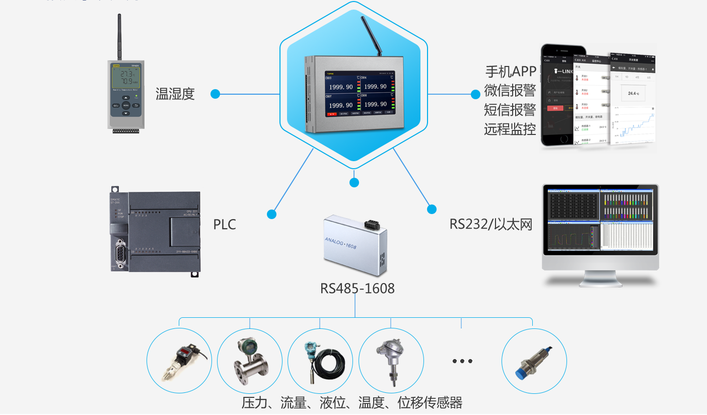 :采用工業(yè)級RS485-1608數(shù)據(jù)采集卡接口小巧便攜,可導(dǎo)軌安裝。專業(yè)采集電壓、電流、溫度、濕度、壓力、振動、頻率、流量、液位等信息。